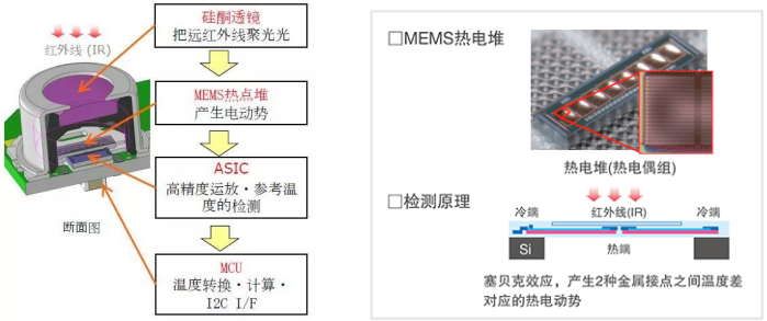 D6T傳感器基于一款紅外傳感器,使用熱電堆元件來吸收目標(biāo)物體的輻射能量,該傳感器可在不接觸物體的情況下測(cè)量物體的表面溫度。D6T采用了先進(jìn)的MEMS熱電堆,將定制化設(shè)計(jì)的傳感器ASIC和信號(hào)微處理器與算法置于小尺寸封裝中,該器件被認(rèn)為提供了超高的信噪比(SNR)。該器件可將傳感器信號(hào)直接轉(zhuǎn)換成數(shù)字溫度輸出,為微控制器提供了直觀的界面。