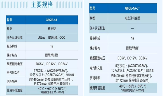 從線圈電壓功耗方面看,G6QE系列在施加電壓100毫秒之后降低施加至線圈上的電壓與額定線圈功耗相比,其功耗減小至12%,有助于設(shè)備的節(jié)能和降低發(fā)熱。