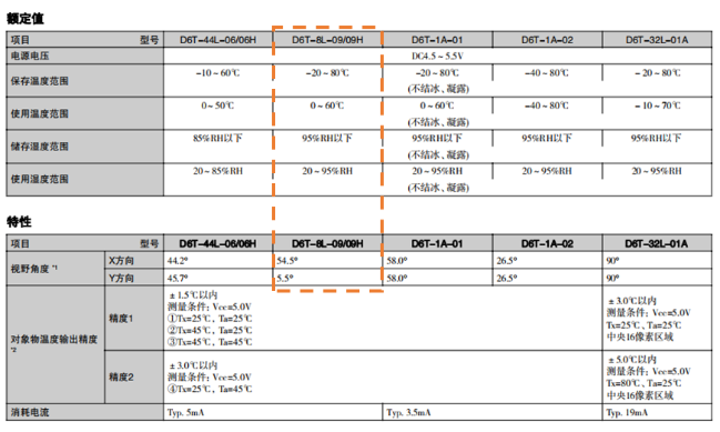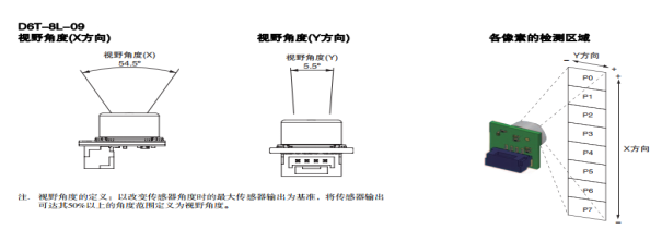 歐姆龍非接觸溫度傳感器D6T-8L-09以其紅外測檢測,I2C數字輸出,抗干擾性強三大優勢為您的產品增加人體感應功能,讓您的產品穩定可靠,獨具特色。此傳感器像素為1x8,檢測區域呈長條形,橫向視場角54.5°,縱向視場角 5.5°,可根據產品的實際應用進行安裝角度調整。