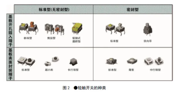 輕觸開(kāi)關(guān)首先可以分為標(biāo)準(zhǔn)型(無(wú)密封型)和密封型。和微動(dòng)開(kāi)關(guān)一樣,密封型輕觸開(kāi)關(guān)采取了防水、防塵措施,在環(huán)境惡劣的場(chǎng)所也能使用。其次,端子形狀可以分為兩種,一種是可以將端子插入印刷基板上的孔中的基板開(kāi)孔插入端子,另一種是可以焊接在基板表面的基板表面封裝端子,還有根據(jù)用途加工成特殊形狀及規(guī)格的產(chǎn)品,比如從側(cè)面進(jìn)行操作的側(cè)按型、操作行程較長(zhǎng)的長(zhǎng)行程型、外形只有米粒大小的超小型等等(圖2)。