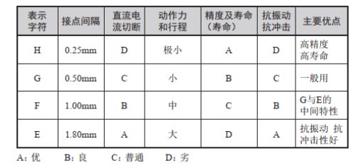 不同的接點間隔,開關(guān)行程的移動差(即MD:從驅(qū)動桿的動作位置到復(fù)位位置的移動距離或者移動角度)、靈敏度、壽命、直流電流切斷、抗沖擊、抗振動的能力都不同。