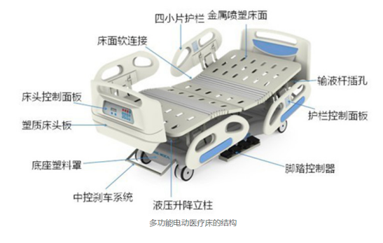 多功能電動醫(yī)療床由ABS床頭、ABS提升護欄、床板、上床架、下床架、升降連桿、電動推桿、控制器、手控板萬向輪等主要部件組成。