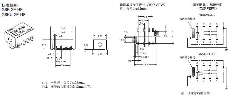 | 單穩(wěn)型 | 塑料密封型 | DPDT(2c) | DC 3, 4.5, 5, 12, 24 | G6K-2P-RF | 30件/根 |