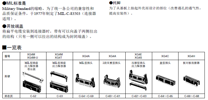 印刷基板連接器的核心、MIL規(guī)格標(biāo)準(zhǔn)品 通過采用新型生產(chǎn)力設(shè)計(jì),高可靠性與低價(jià)格的同步實(shí)現(xiàn)。 備有便于省空間封裝的盒型插頭(XG4C)。 同時(shí)具有可進(jìn)行中繼使用的壓接型插頭(XG4E)。 將本公司的散線壓接型連接器(XG5)特有插頭(XG8)與PCB型(XG2)組合使用可實(shí)現(xiàn)種類豐富的各種封裝。 適用本公司自己開發(fā)的簡(jiǎn)易鎖定擺桿可以使特有插頭(XG8)和盒型插頭(XG4C)也能夠進(jìn)行鎖定。 MIL規(guī)格(MIL-C-83503)標(biāo)準(zhǔn)。 標(biāo)準(zhǔn)品符合UL規(guī)格(File No. E103202)認(rèn)證產(chǎn)品。
