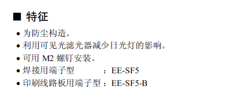 EE-SF5 微型光電傳感器[反射型] 為防塵構(gòu)造。 利用可見光濾光器減少日光燈的影響。 可用M3 螺釘安裝。 焊接用端子型:EE-SF5 印刷線路板用端子型:EE-SF5-B